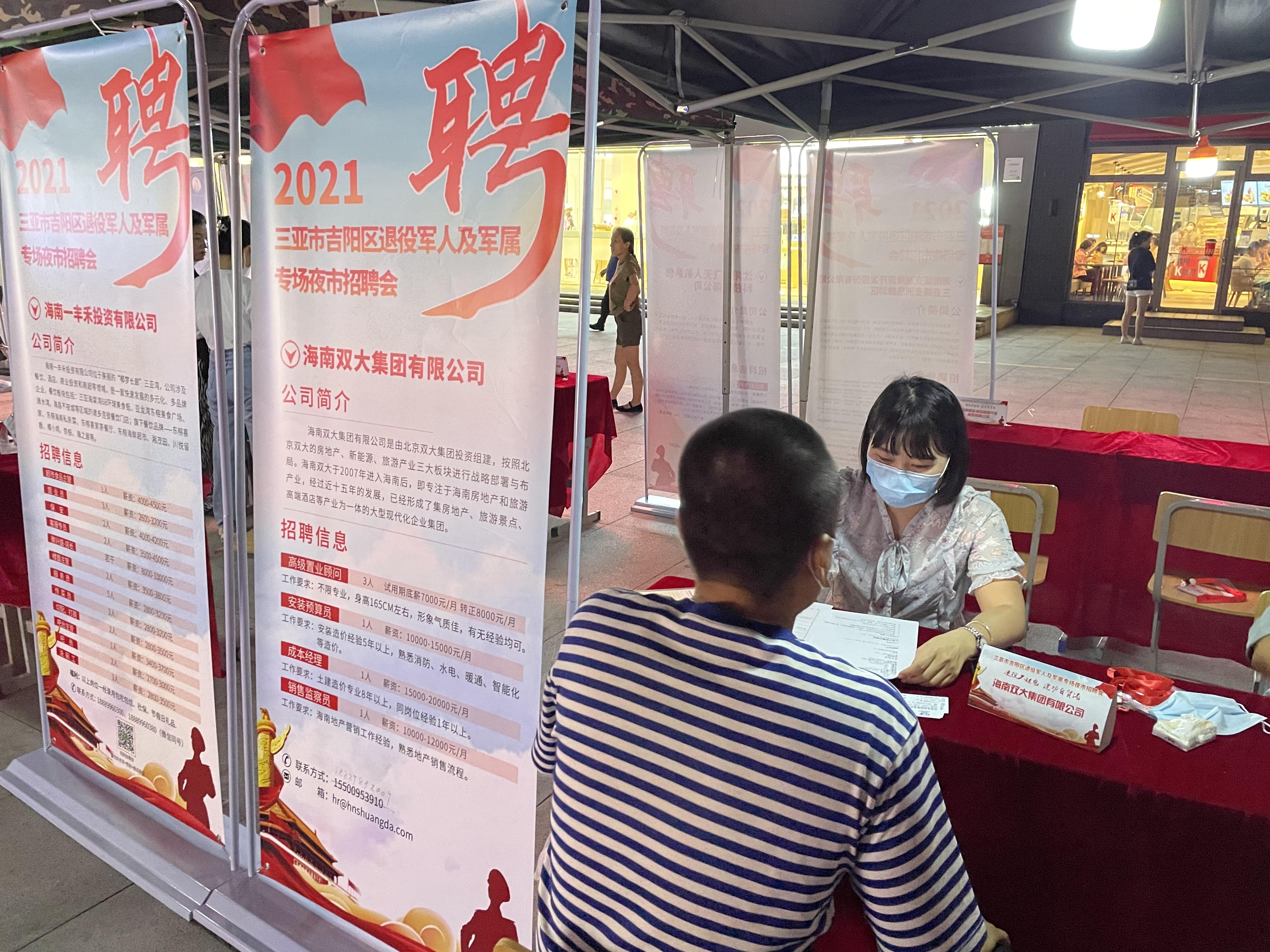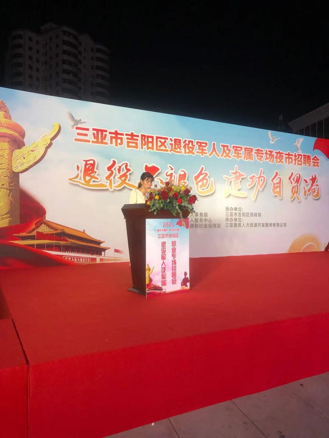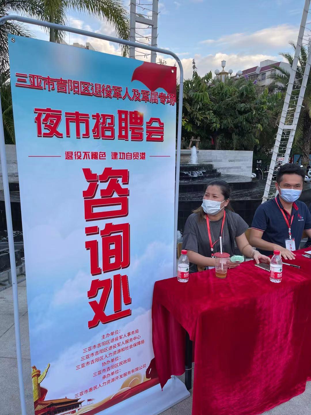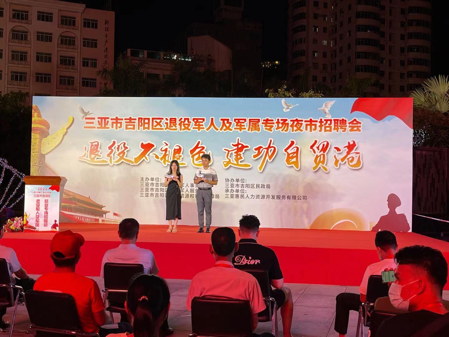 9月27日,由吉陽區(qū)退役軍人事務(wù)局、吉陽區(qū)退役軍人服務(wù)中心、吉陽區(qū)人力資源和社會保障局主辦,吉陽區(qū)民政局協(xié)辦,三亞惠民人力資源開發(fā)服務(wù)有限公司(惠民人力資源)承辦的三亞市吉陽區(qū)2021年退役軍人及家屬就業(yè)專場夜市招聘會在藍海購物廣場舉行。
